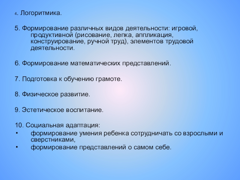 5. Формирование различных видов деятельности: игровой, продуктивной (рисование, лепка,