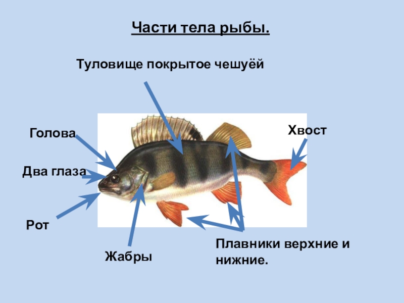 Части тела рыбы.Туловище покрытое чешуёйГолова Два глазаРот Жабры Плавники верхние и нижние. Хвост