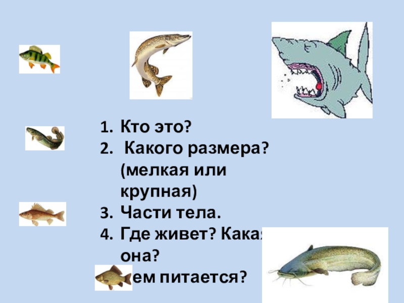Кто это? Какого размера? (мелкая или крупная)Части тела.Где живет? Какая она?Чем питается?