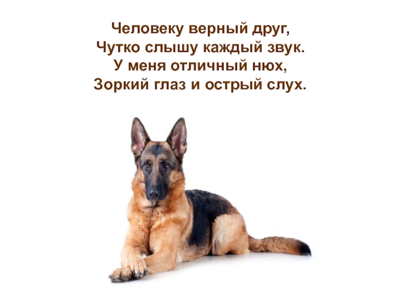 Слайд 6 Человеку верный друг, Чутко слышу каждый звук. У меня отличный нюх, Зоркий глаз и