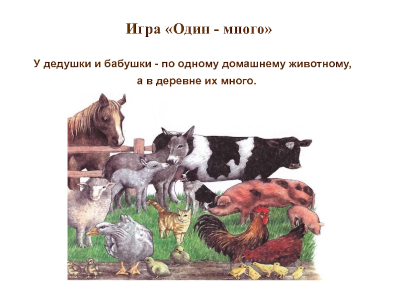 Игра «Один - много»  У дедушки и бабушки - по одному домашнему животному,