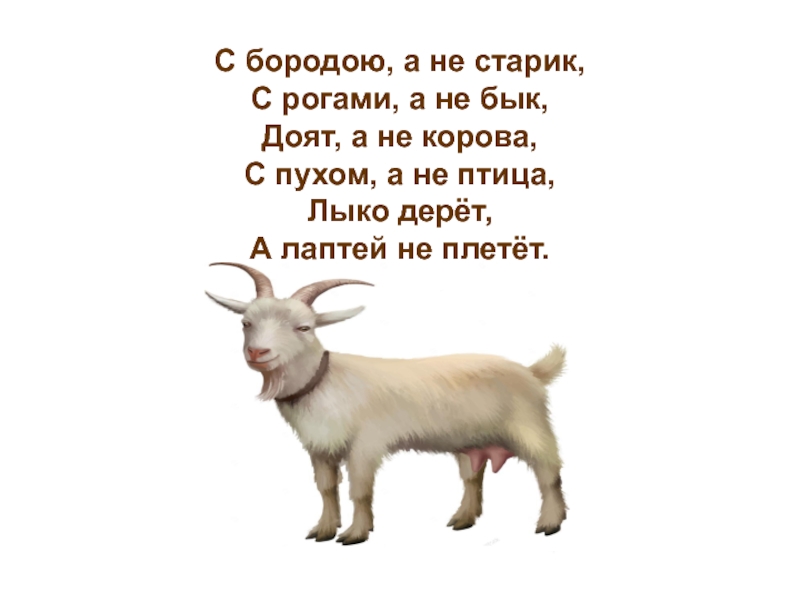 Слайд 3 С бородою, а не старик, С рогами, а не бык, Доят, а не