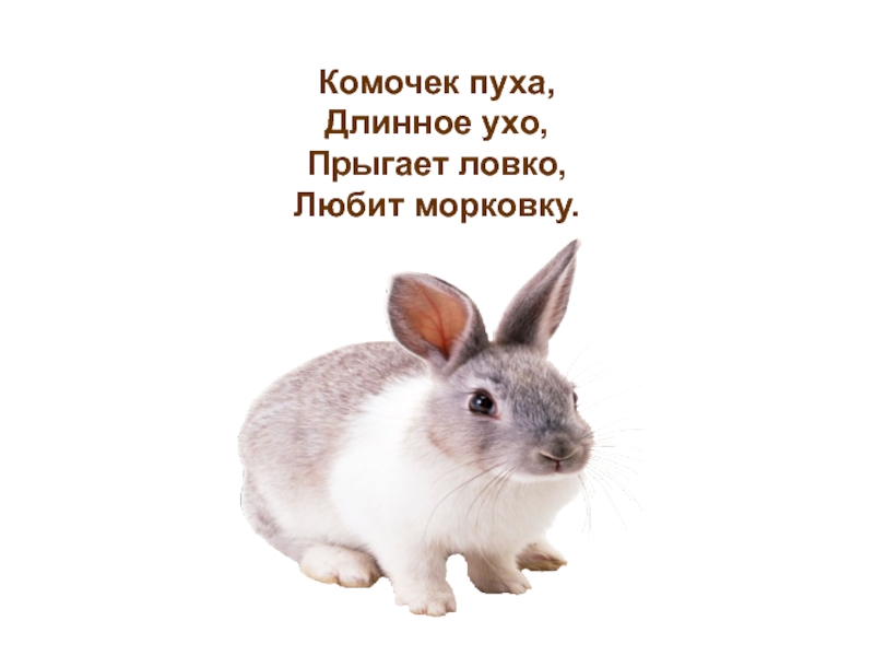 Слайд 7 Комочек пуха, Длинное ухо,  Прыгает ловко,  Любит морковку.