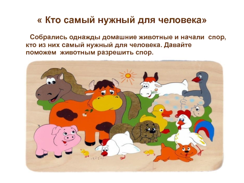 домашние животные и начали  спор, кто из них самый нужный для человека. Давайте поможем  животным разрешить спор.