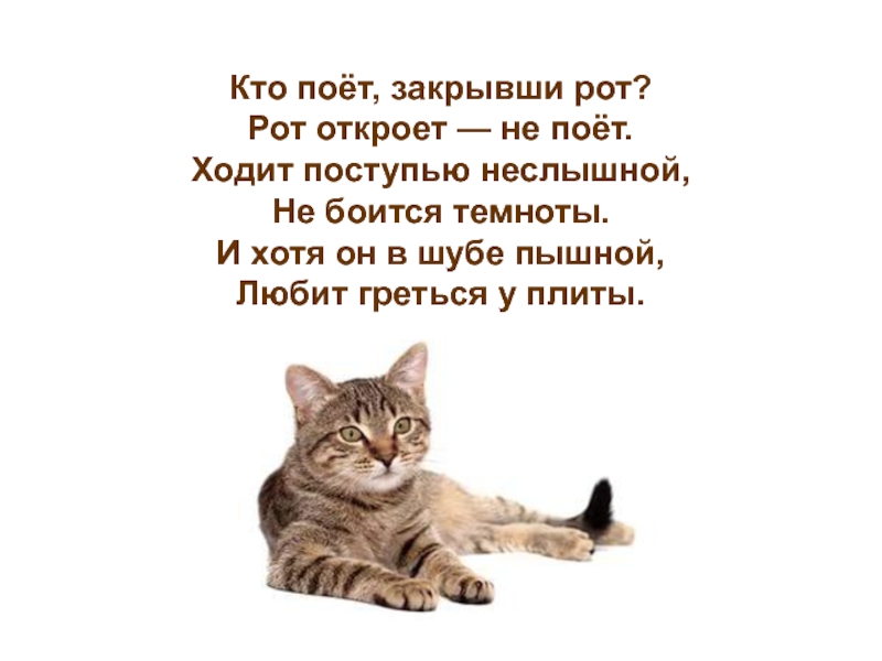 Слайд 2Кто поёт, закрывши рот? Рот откроет — не поёт. Ходит поступью неслышной, Не боится