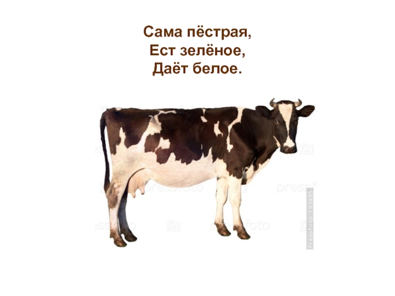 Слайд 4 Сама пёстрая, Ест зелёное, Даёт белое.
