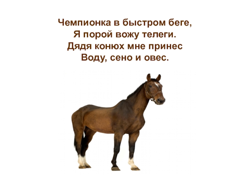 Слайд 5 Чемпионка в быстром беге, Я порой вожу телеги. Дядя конюх мне принес Воду, сено