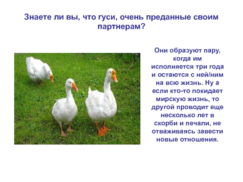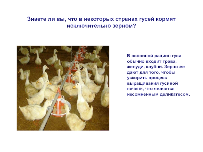В основной рацион гуся обычно входит трава, желуди, клубни. Зерно же дают для того, чтобы ускорить процесс выращивания гусиной печени, что является несомненным деликатесом.