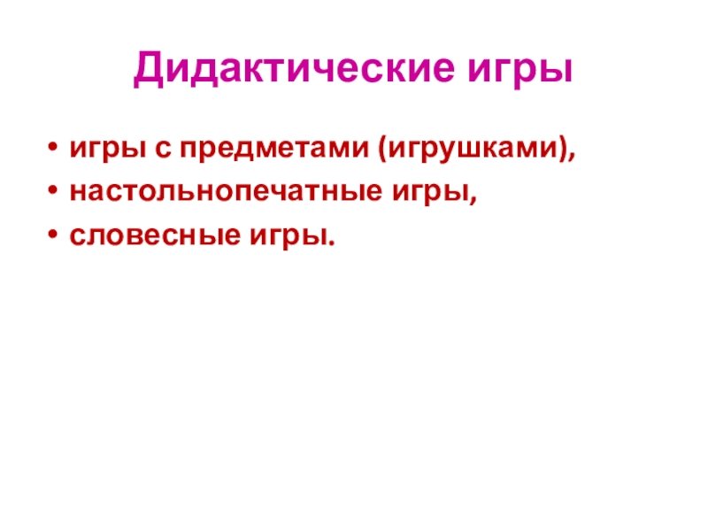 Дидактические игрыигры с предметами (игрушками),настольно­печатные игры, словесные игры.