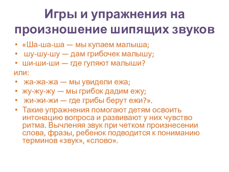 Игры и упражнения на произношение шипящих звуков«Ша-ша-ша — мы купаем малыша; шу-шу-шу — дам грибочек малышу; ши-ши-ши