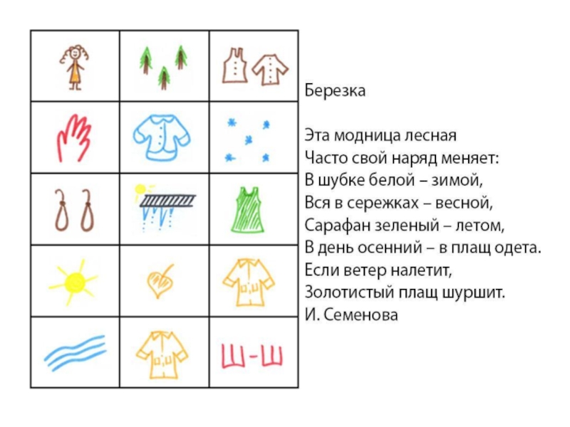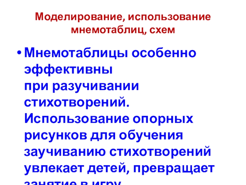 Моделирование, использование мнемотаблиц, схемМнемотаблицы особенно эффективны при разучивании стихотворений. Использование опорных рисунков для обучения заучиванию стихотворений увлекает детей,