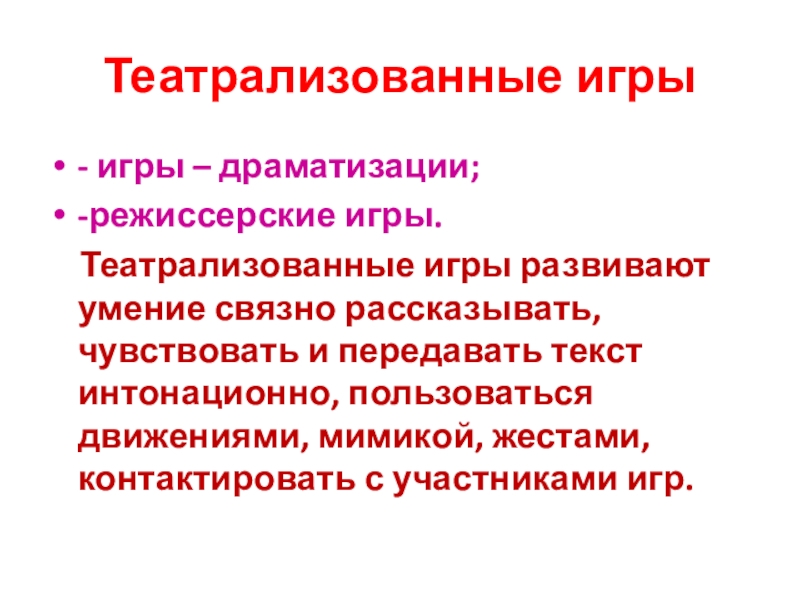 Театрализованные игры- игры – драматизации;-режиссерские игры.  Театрализованные игры развивают умение связно рассказывать, чувствовать и передавать текст
