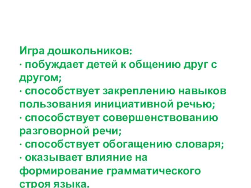 Игра дошкольников: · побуждает детей к общению друг с другом; · способствует закреплению навыков пользования инициативной речью;