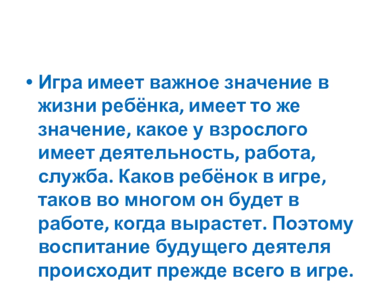 Игра имеет важное значение в жизни ребёнка, имеет то же значение, какое у взрослого имеет деятельность, работа, служба. Каков ребёнок в игре, таков во многом он будет в работе, когда вырастет. Поэтому воспитание будущего деятеля происходит