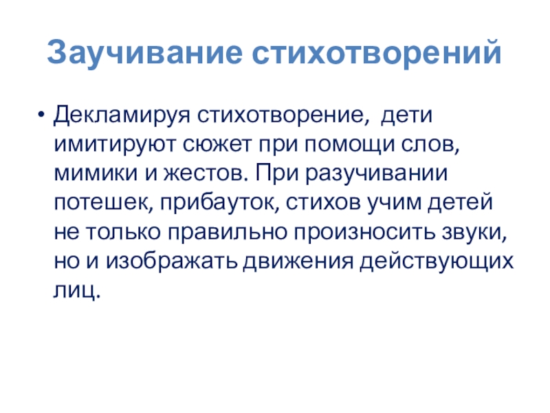 Заучивание стихотворенийДекламируя стихотворение,  дети имитируют сюжет при помощи слов, мимики и жестов. При разучивании потешек, прибауток, стихов