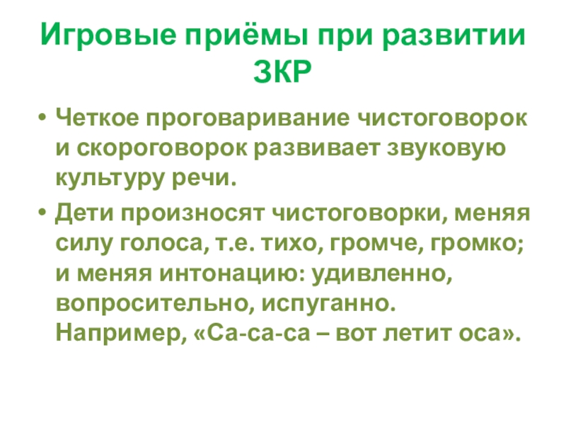 Игровые приёмы при развитии ЗКРЧеткое проговаривание чистоговорок и скороговорок развивает звуковую культуру речи. Дети произносят чистоговорки, меняя