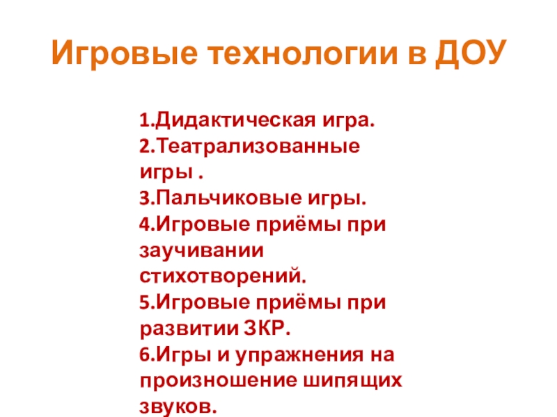 Игровые технологии в ДОУ1.Дидактическая игра.2.Театрализованные игры .3.Пальчиковые игры. 4.Игровые приёмы при заучивании стихотворений. 5.Игровые приёмы при развитии ЗКР.