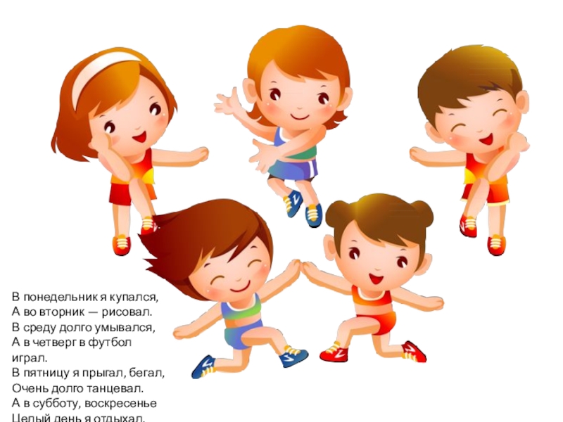 долго умывался, А в четверг в футбол играл. В пятницу я прыгал, бегал, Очень долго танцевал. А в субботу, воскресенье Целый день я отдыхал.