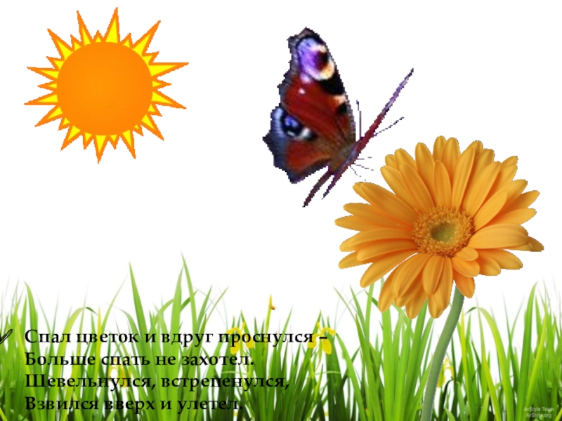 Слайд 2Спал цветок и вдруг проснулся – Больше спать не захотел. Шевельнулся, встрепенулся, Взвился вверх