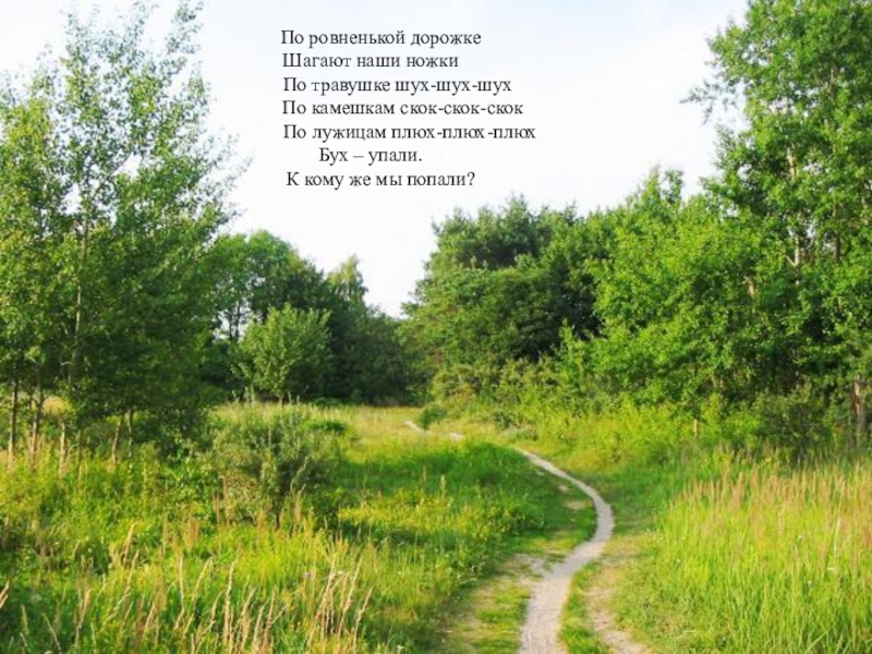 По ровненькой дорожке Шагают наши ножки По травушке шух-шух-шух По камешкам скок-скок-скок