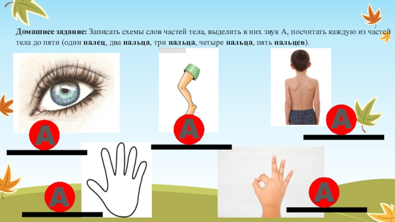 Домашнее задание: Записать схемы слов частей тела, выделить в них звук А, посчитать каждую из частей тела