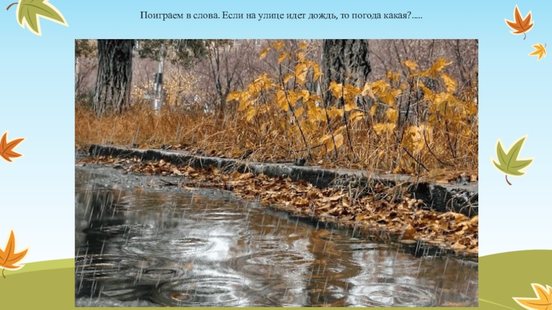 Слайд 11Поиграем в слова. Если на улице идет дождь, то погода какая?.....