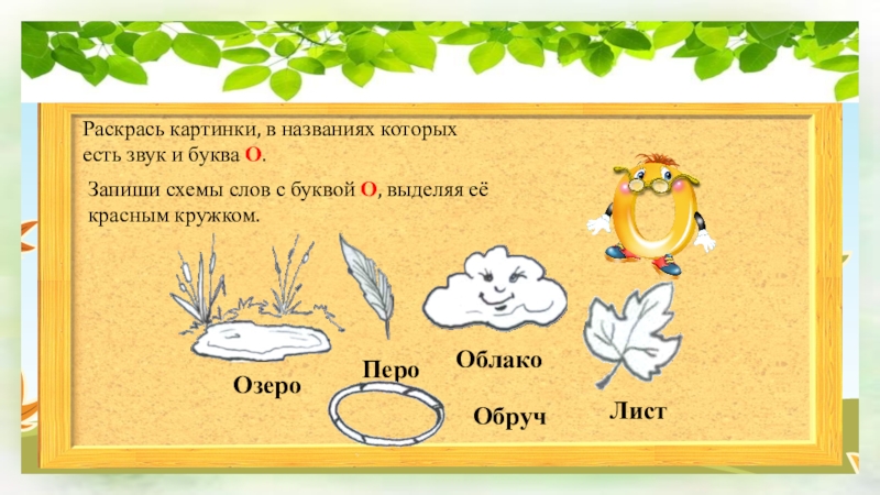 ОблакоОзероЛистПероОбручРаскрась картинки, в названиях которых есть звук и буква О.Запиши схемы слов с буквой О, выделяя её