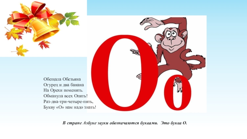 В стране Азбуке звуки обозначаются буквами. Это буква О.Обещала Обезьяна Огурец и два бананаНа Орехи поменять.Обманула всех Опять!Раз-два-три-четыре-пять,Букву