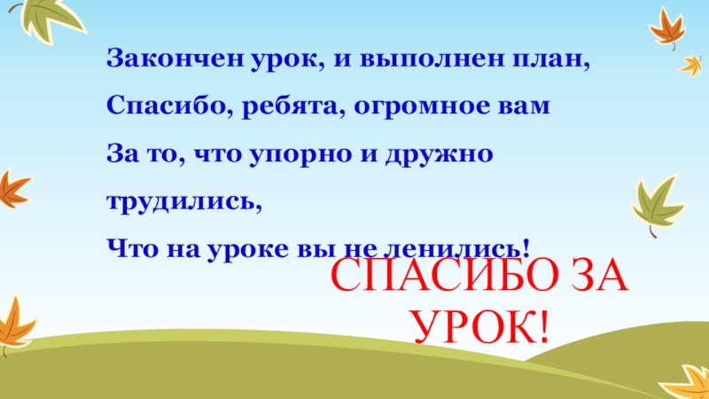 СПАСИБО ЗА УРОК!Закончен урок, и выполнен план,Спасибо, ребята, огромное вамЗа то, что упорно и дружно трудились,Что на