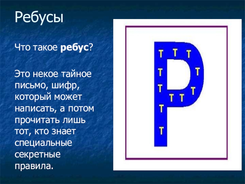 Ребусы Что такое ребус? Это некое тайное письмо, шифр, который может написать, а потом прочитать лишь тот,