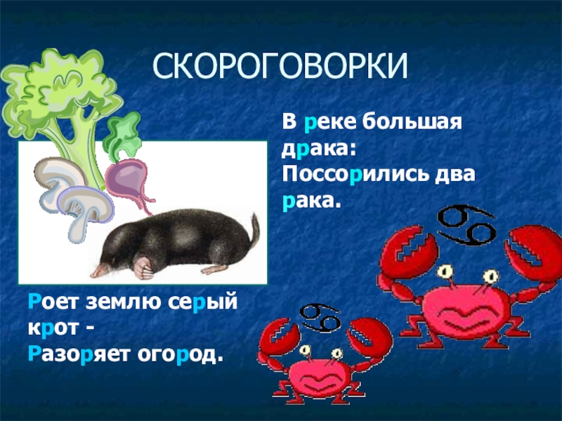 СКОРОГОВОРКИРоет землю серый крот - Разоряет огород.В реке большая драка: Поссорились два рака.