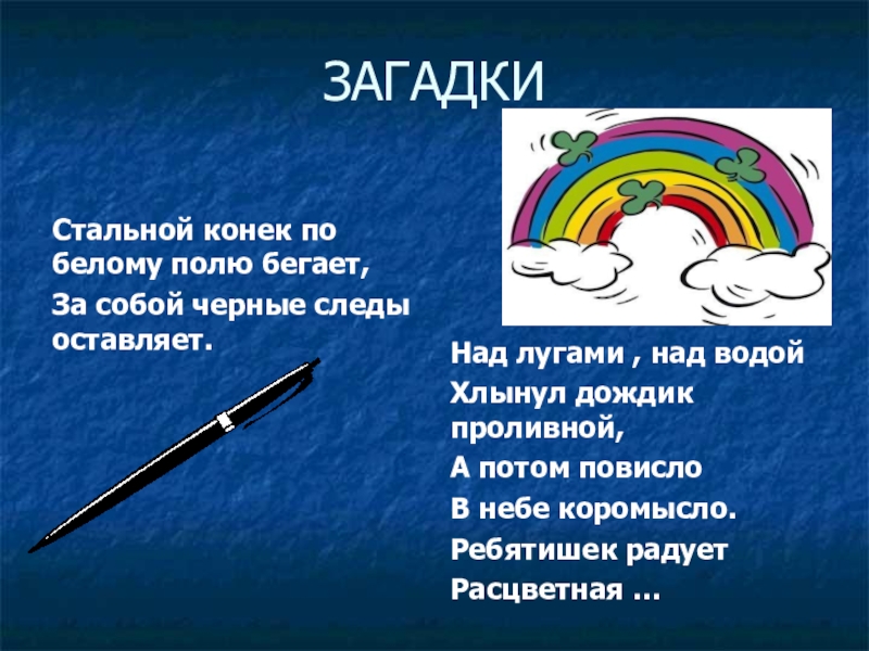 ЗАГАДКИСтальной конек по белому полю бегает,За собой черные следы оставляет.Над лугами , над водойХлынул дождик проливной,А потом