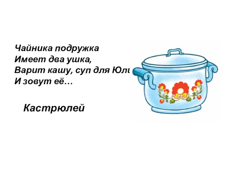 Чайника подружкаИмеет два ушка,Варит кашу, суп для Юли.И зовут её… Кастрюлей