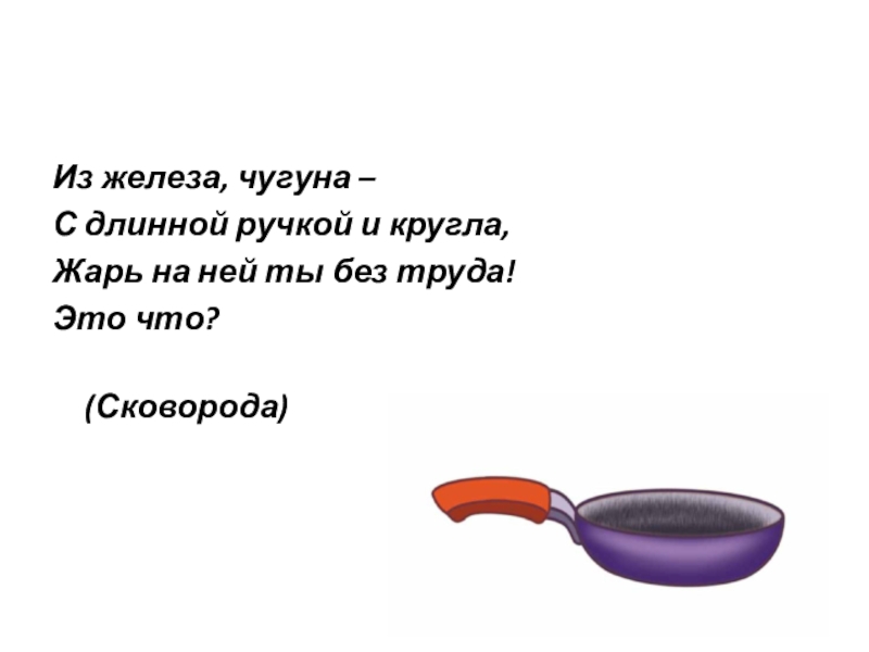 Из железа, чугуна –С длинной ручкой и кругла,Жарь на ней ты без труда!Это что?  (Сковорода)