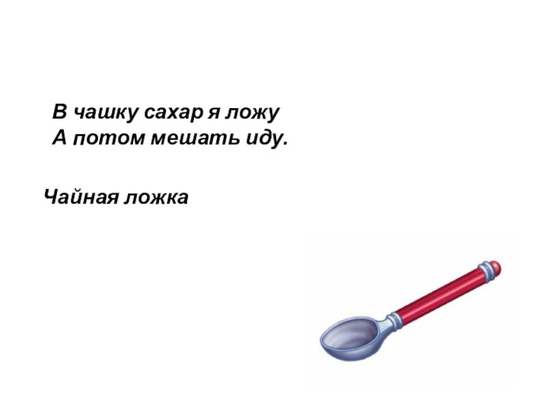 В чашку сахар я ложу  А потом мешать иду. Чайная ложка
