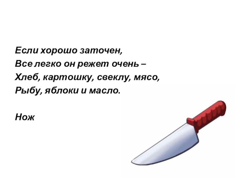 Если хорошо заточен,Все легко он режет очень –Хлеб, картошку, свеклу, мясо,Рыбу, яблоки и масло.Нож