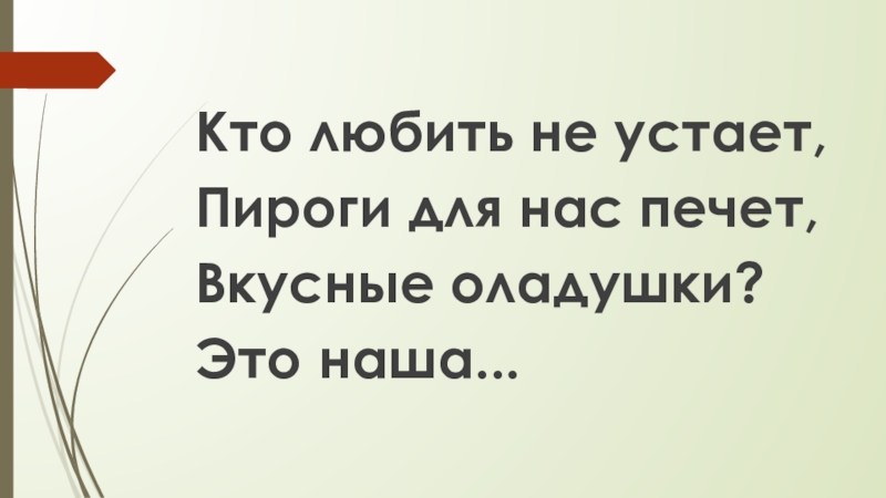 Кто любить не устает,Пироги для нас печет,Вкусные оладушки?Это наша...