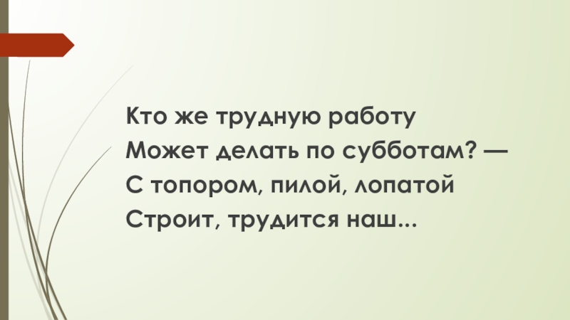 Кто же трудную работуМожет делать по субботам? —С топором, пилой, лопатойСтроит, трудится наш...