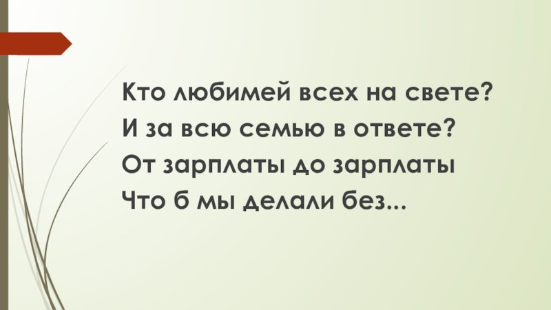Кто любимей всех на свете?И за всю семью в ответе?От зарплаты до зарплатыЧто б мы делали без...