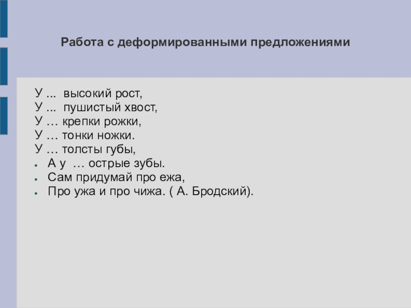 Работа с деформированными предложениямиУ ... высокий рост,У ... пушистый хвост, У … крепки рожки,У … тонки ножки.У