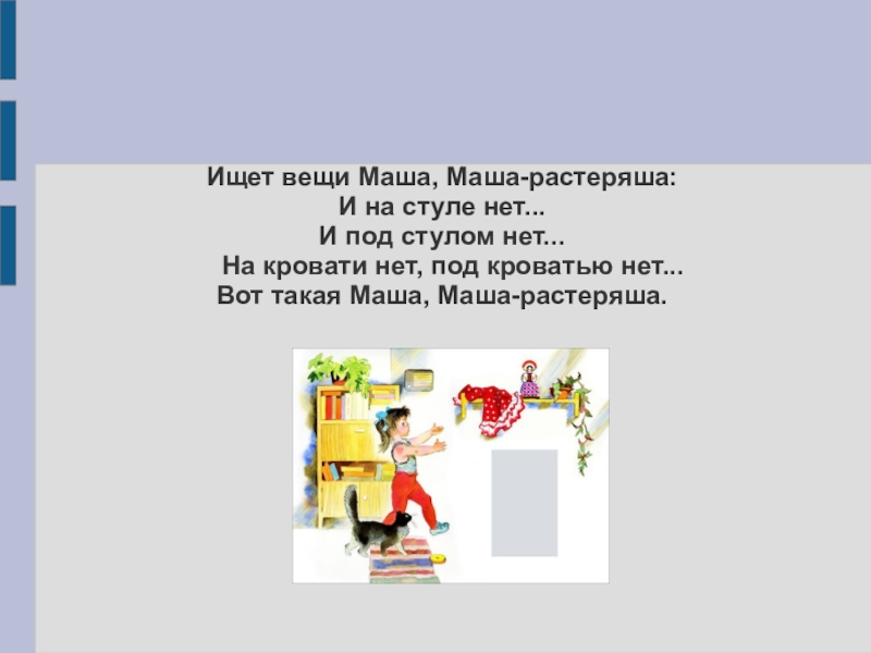 Слайд 7 Ищет вещи Маша, Маша-растеряша: И на стуле нет... И под стулом нет...