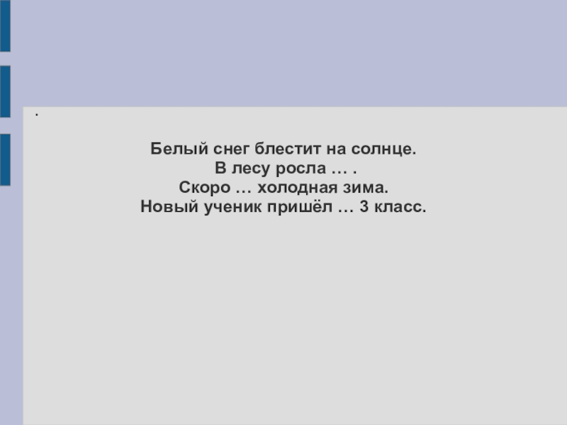 Белый снег блестит на солнце. В лесу росла … . Скоро … холодная зима. Новый ученик пришёл … 3 класс. .