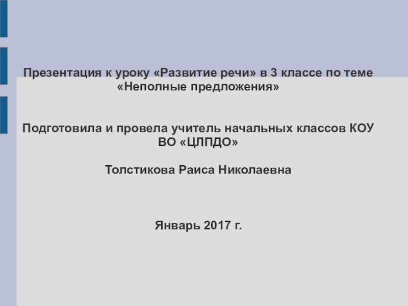 предложения» Подготовила и провела учитель начальных классов КОУ ВО «ЦЛПДО» Толстикова Раиса Николаевна Январь 2017 г.