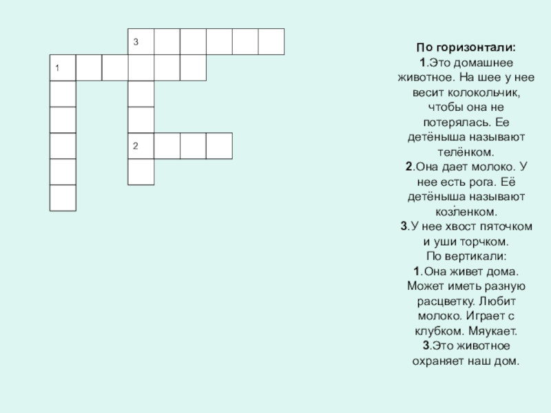 :123По горизонтали:1.Это домашнее животное. На шее у нее весит колокольчик, чтобы она не потерялась. Ее детёныша называют
