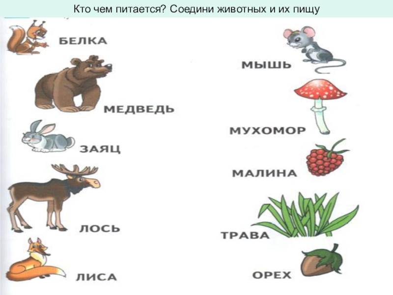 Кто чем питается? Соедини животных и их пищу