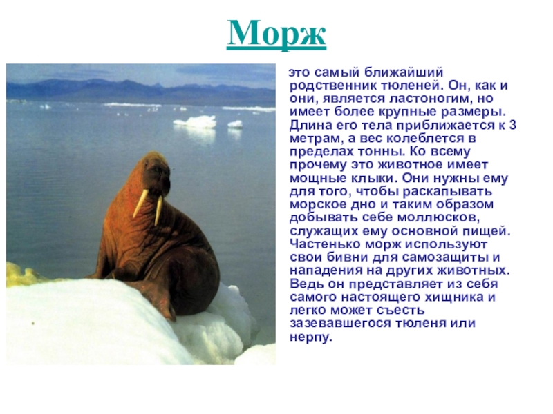 они, является ластоногим, но имеет более крупные размеры. Длина его тела приближается к 3 метрам, а вес колеблется в пределах тонны. Ко всему прочему это животное имеет мощные клыки. Они нужны ему для того, чтобы раскапывать морское дно и таким образом добывать себе моллюсков, служащих ему основной пищей. Частенько морж используют свои бивни для самозащиты и нападения на других животных. Ведь он представляет из себя самого настоящего хищника и легко может съесть зазевавшегося тюленя или нерпу.
