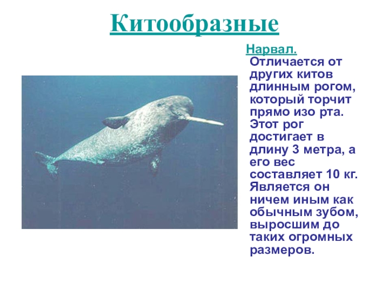 прямо изо рта. Этот рог достигает в длину 3 метра, а его вес составляет 10 кг. Является он ничем иным как обычным зубом, выросшим до таких огромных размеров.