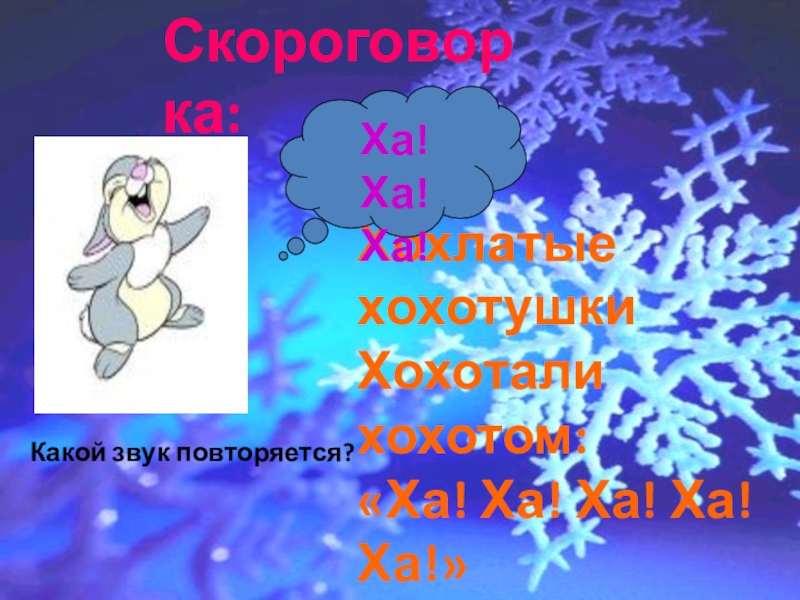 Скороговорка:Хохлатые хохотушкиХохотали хохотом:«Ха! Ха! Ха! Ха! Ха!»Какой звук повторяется?Ха! Ха! Ха!