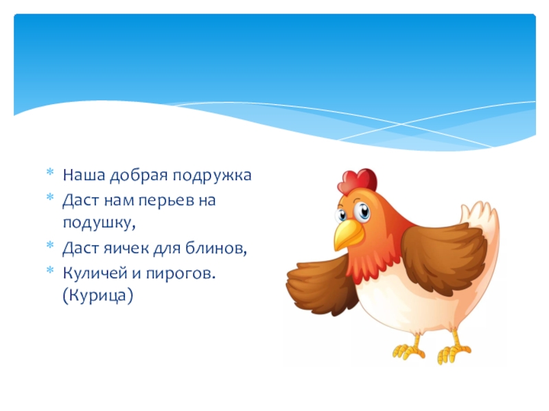 Наша добрая подружкаДаст нам перьев на подушку,Даст яичек для блинов,Куличей и пирогов. (Курица)