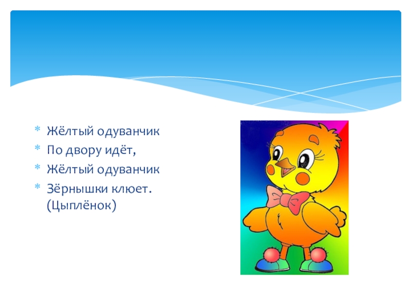 Жёлтый одуванчикПо двору идёт,Жёлтый одуванчикЗёрнышки клюет. (Цыплёнок)